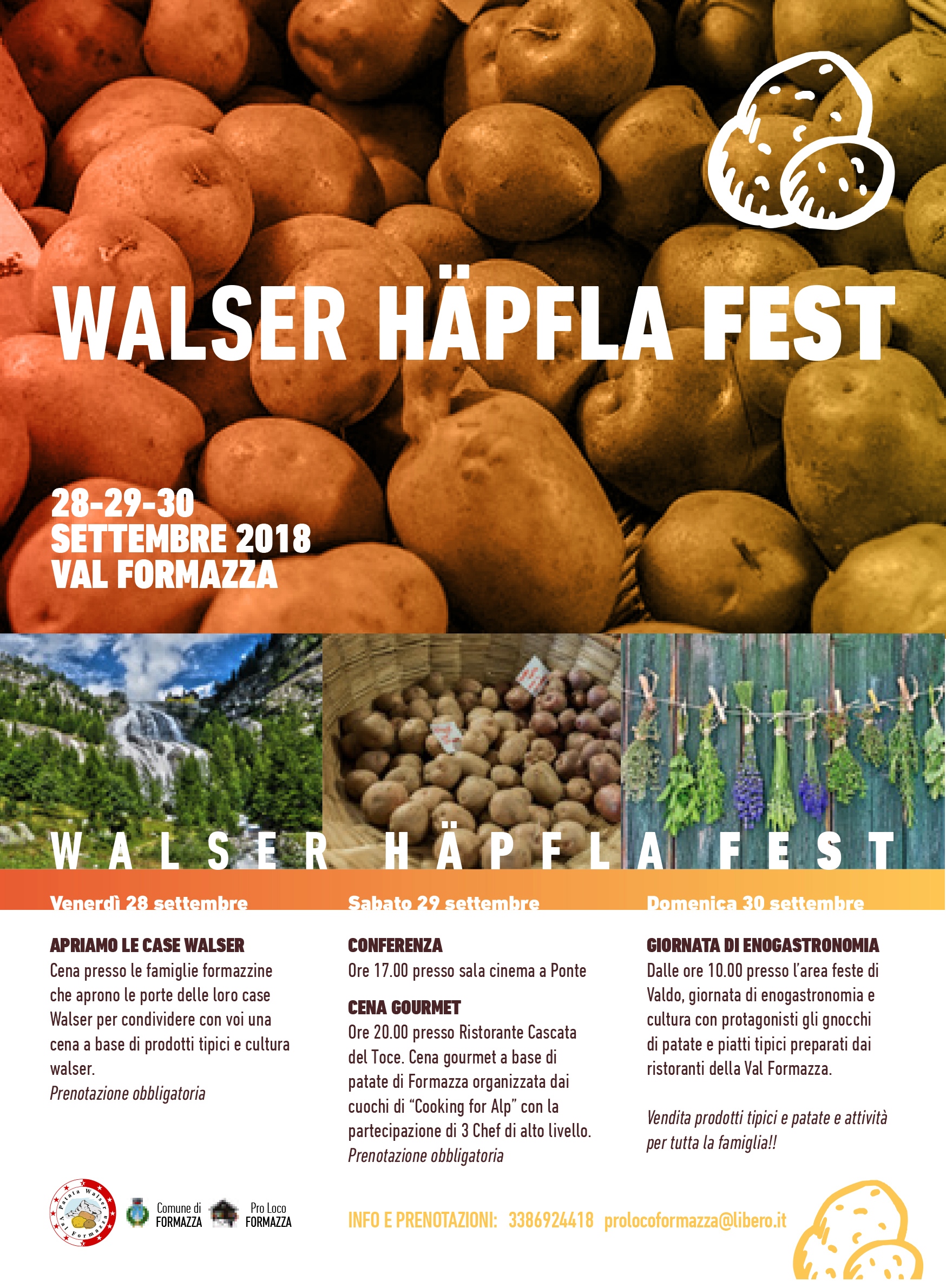 Appuntamento il 28 – 29 – 30 Settembre, in Val Formazza con la “Walser Häpfla Fest”, una manifestazione dedicata alla tipica patata formazzina, unica perché coltivata ad un’altitudine molto elevata.