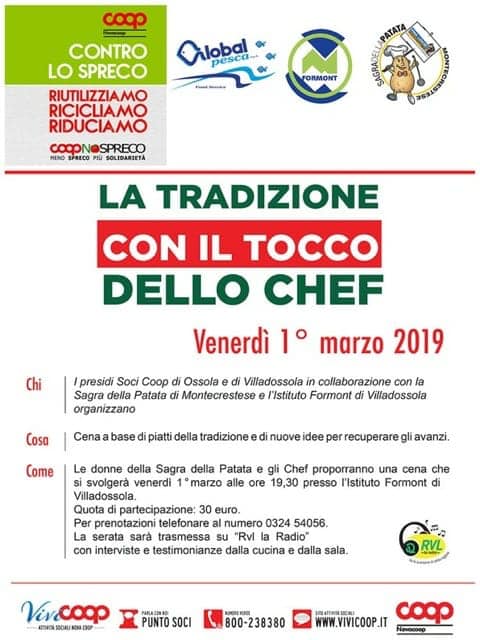 Sagra della Patata Montecrestese FORMONT – Valli dell’Ossola e Coop vi invitano ad una cena dove si incontrano la tradizione e nuove idee per non sprecare e recuperare gli avanzi.